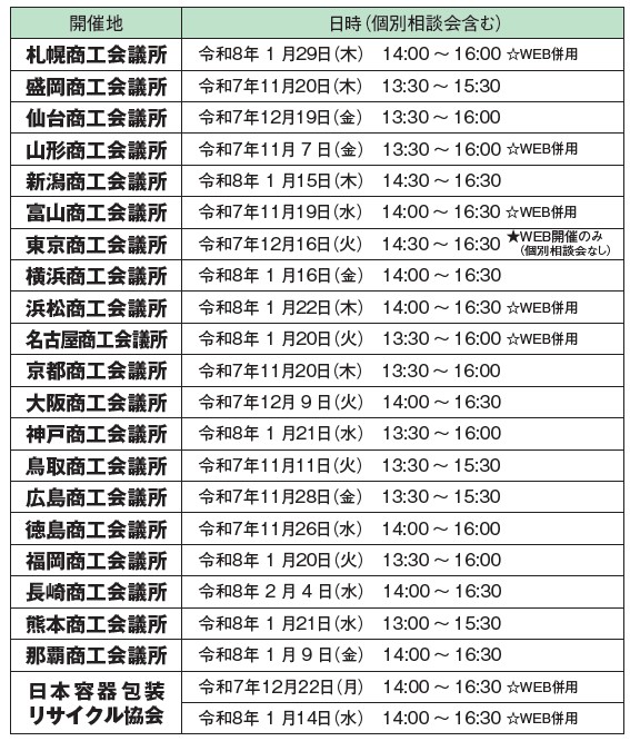 当協会は、各地商工会議所・日本商工会議所と共催で、容器包装に関わる特定事業者の皆様を対象に、「容器包装リサイクル制度説明会・個別相談会」を開催します。